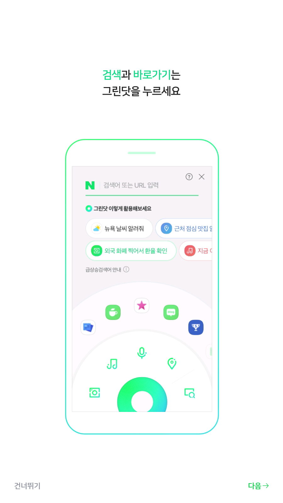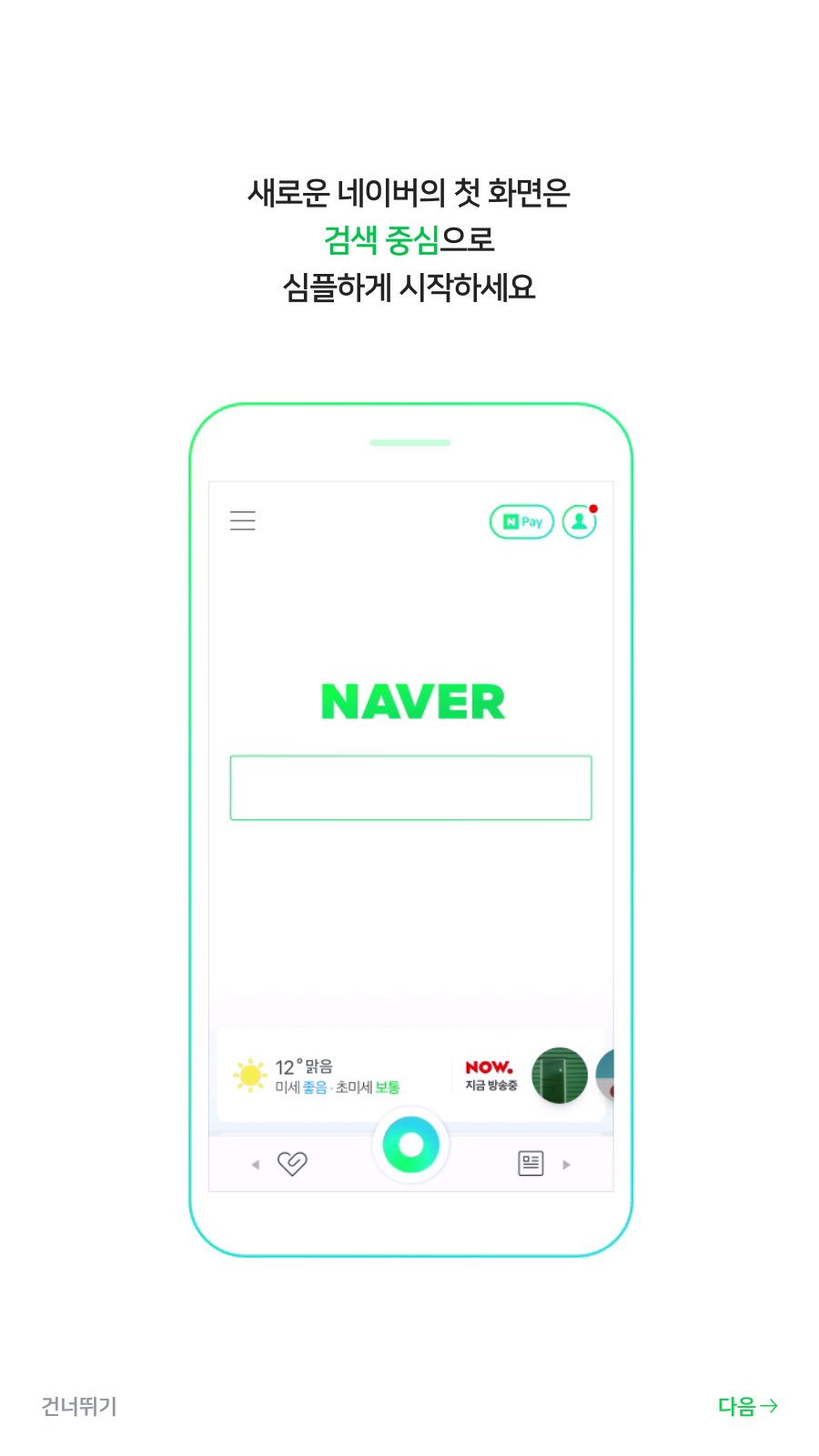간단하게 네이버앱의 설명이 나옵니다. 이미 사용하셨던 분들은 <건너뛰기>를 하셔도되며, 그래도 한번 둘러보겠다고 생각하신다면 <다음>을 눌러주세요.