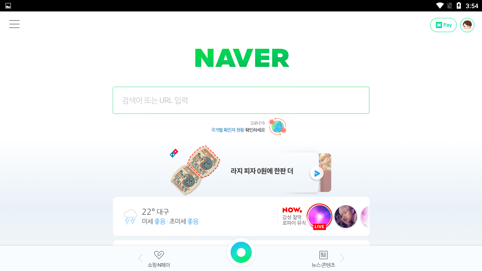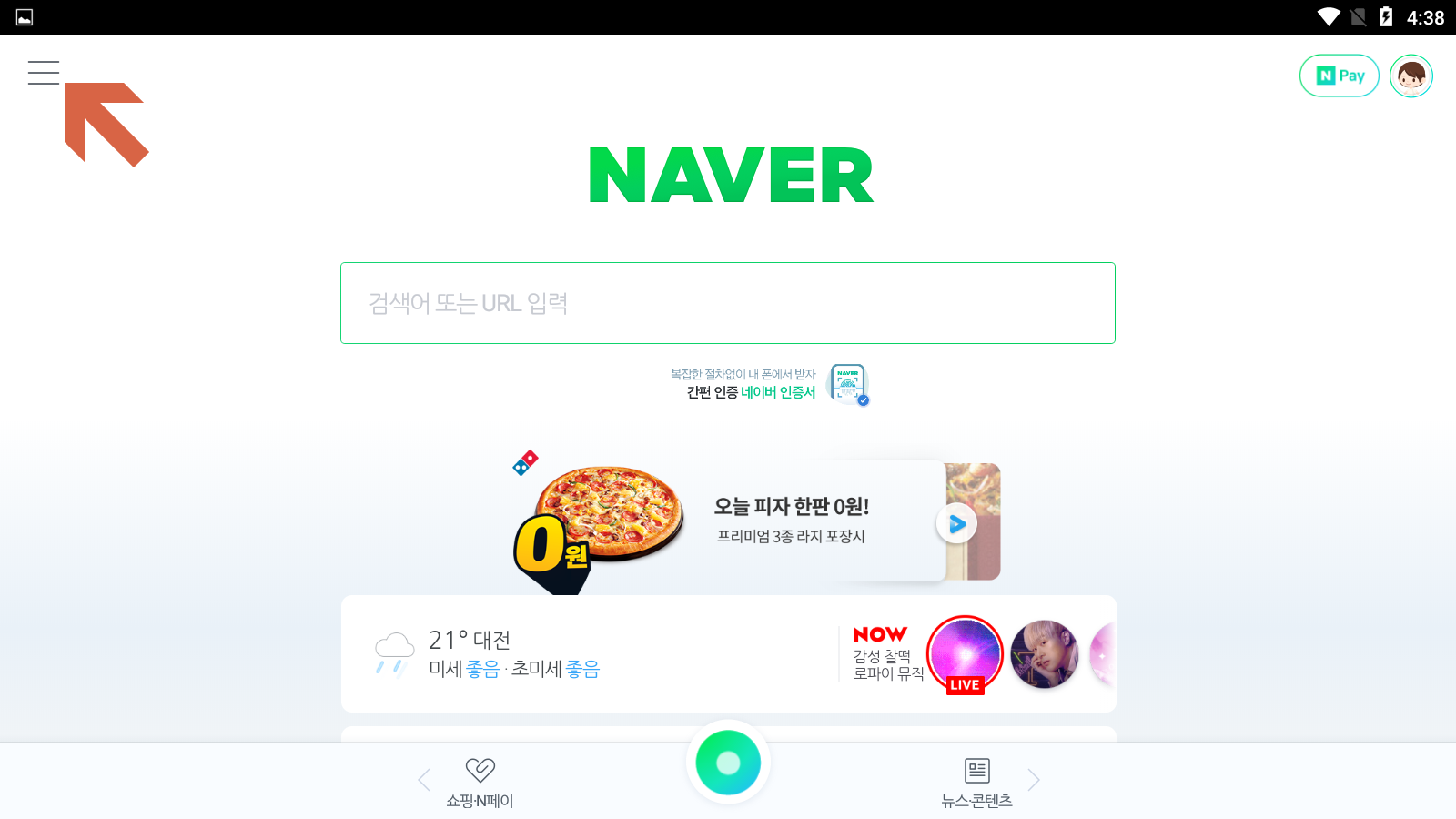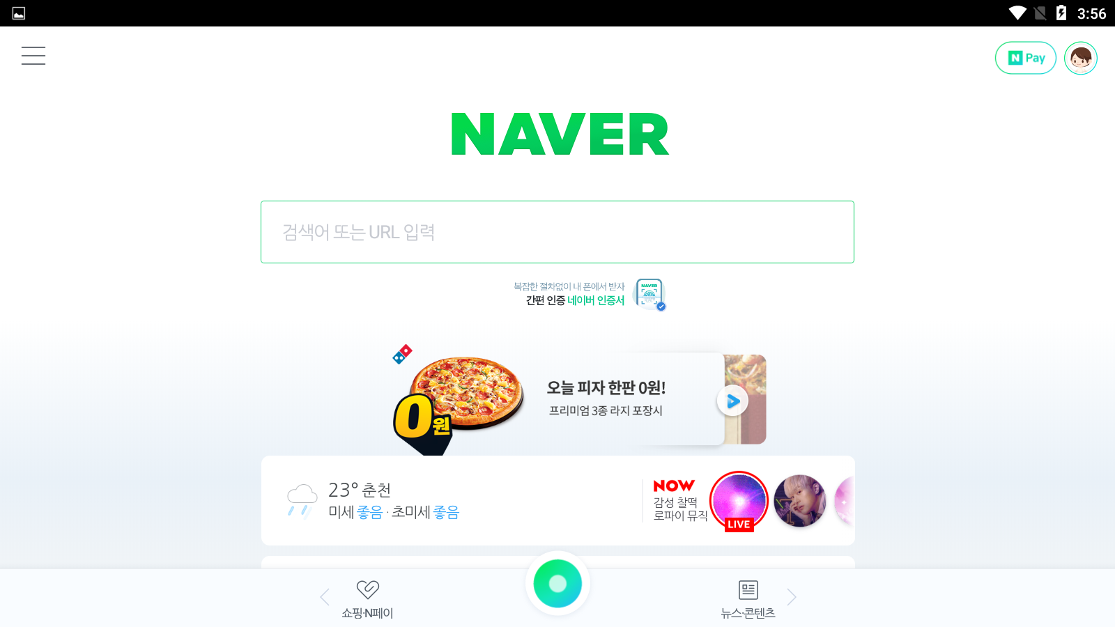 이제 네이버앱을 사용하실 수 있습니다. 아래 <뉴스콘텐츠>를 눌러볼까요?