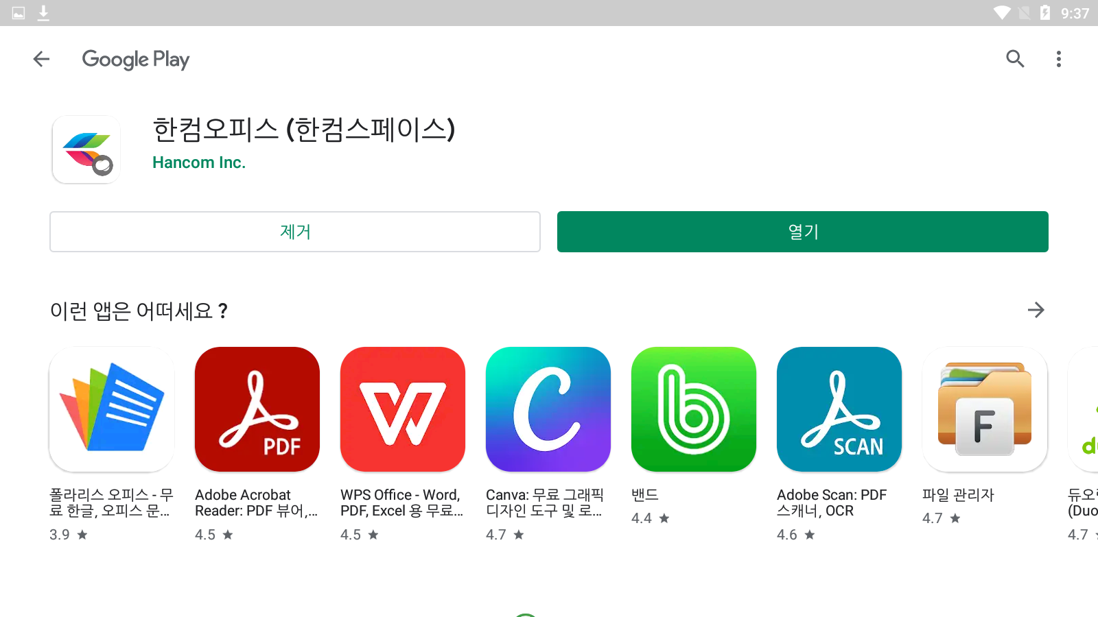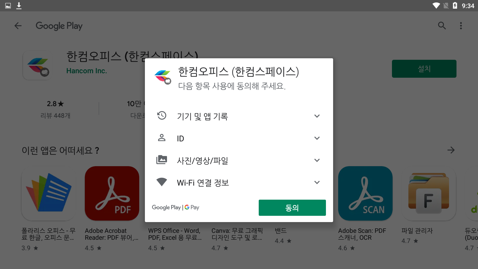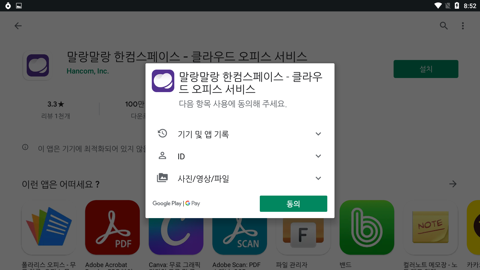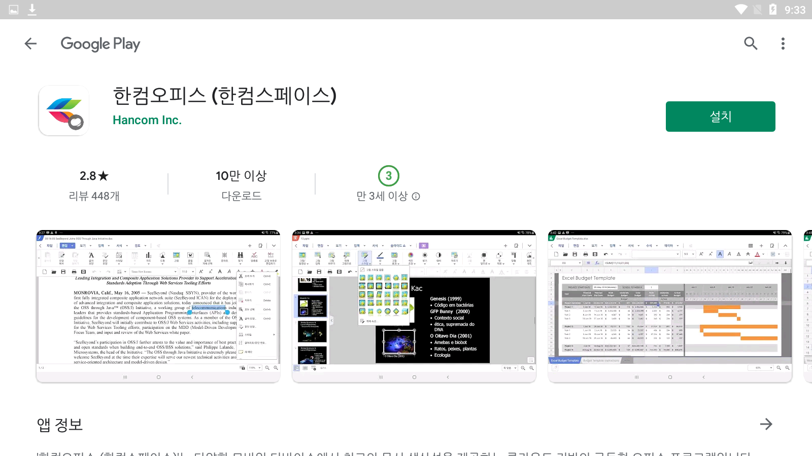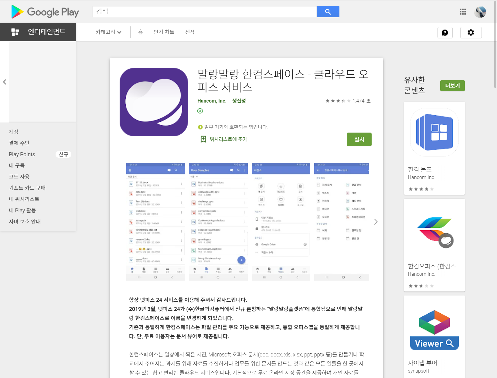 구글 플레이 스토어에서 한컴스페이스용 한컴오피스의 설치 페이지가 열립니다. <설치>를 누릅니다.