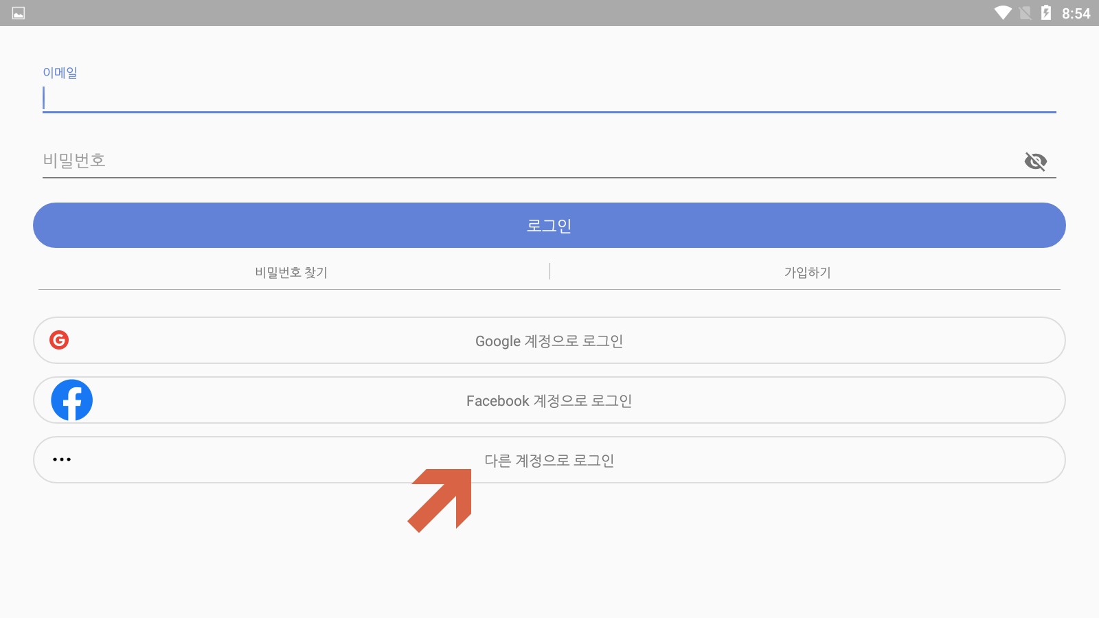 <열기>를 누르면 회원가입하라고 나타납니다. 구글과 페이스북 계정을 사용하여 로그인이 가능하며, 추가로 다른 계정으로 로그인이 가능합니다.